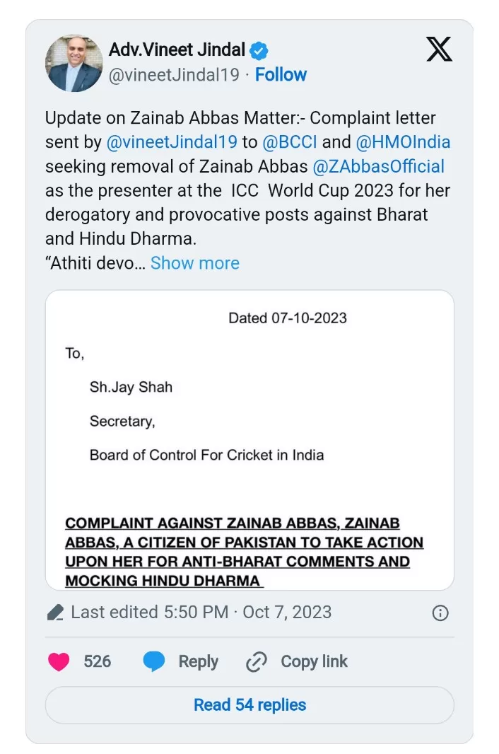 Two days later, on October 7, Jindal shared a redacted version of another letter addressed to Board of Cricket Control of India Secretary Jay Shah. This letter contained the recipient’s name and the subject, urging action against the presenter for her purported anti-India remarks.