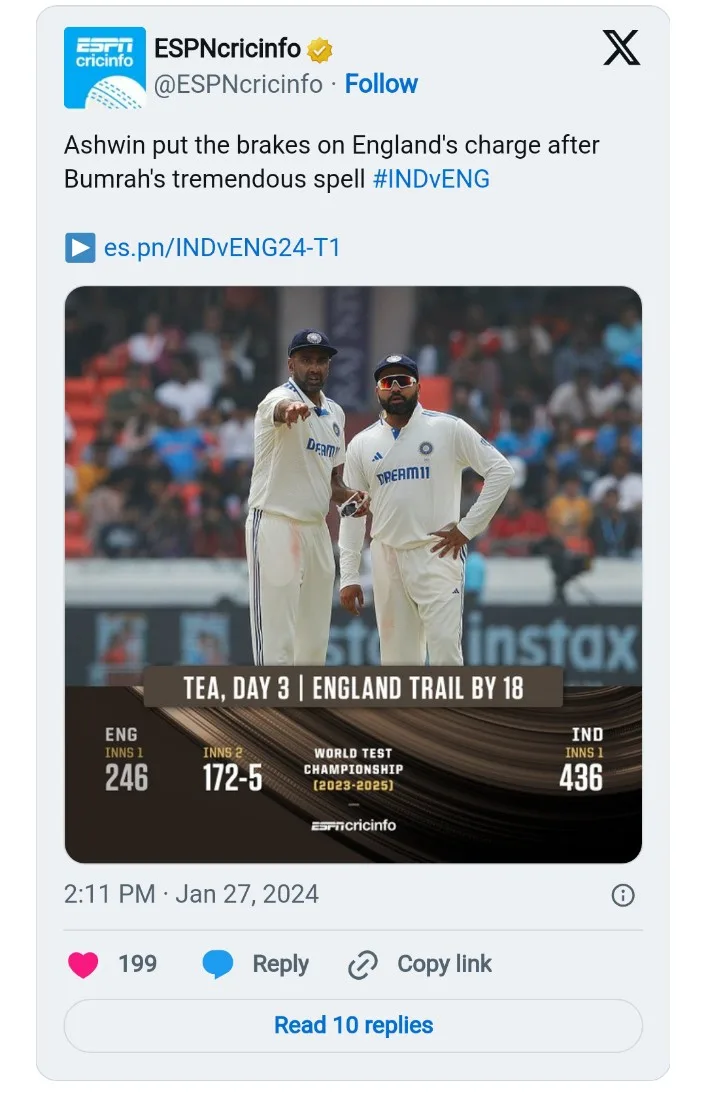 Root, who returned figures of 4-79, got Jadeja out and bowled Bumrah on the next ball but Mohammed Siraj avoided the hat-trick.
