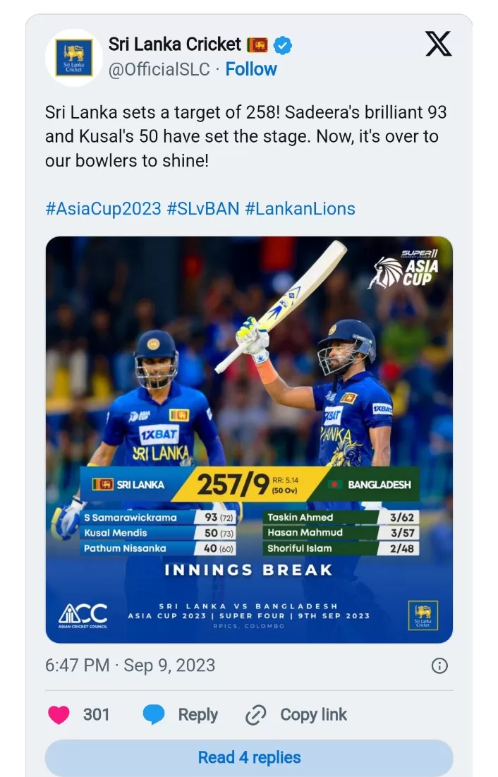Samarawickrama’s scintillating innings of 93 propelled Sri Lanka to a commanding 257-9 in their inaugural Super Four showdown of the Asia Cup against Bangladesh on a pivotal Saturday.