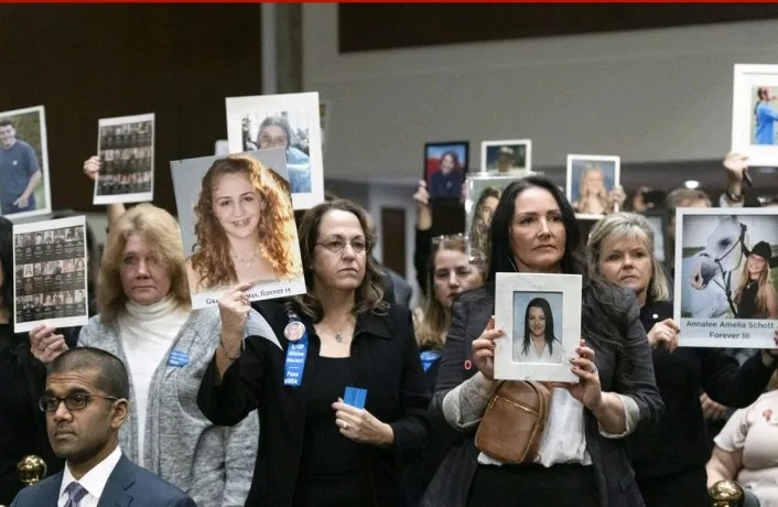 The hearing began with recorded testimony from kids and parents who said they or their children were exploited on social media. Throughout the hourslong event, parents who lost children to suicide silently held up pictures of their dead kids.