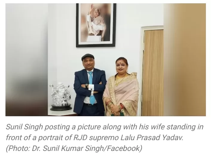 Accompanied by a photo of himself and his wife standing before a portrait of RJD patriarch Lalu Prasad Yadav, Sunil Singh shared on social media, “The picture of the one who gave me an identity, the name is there above my head.”