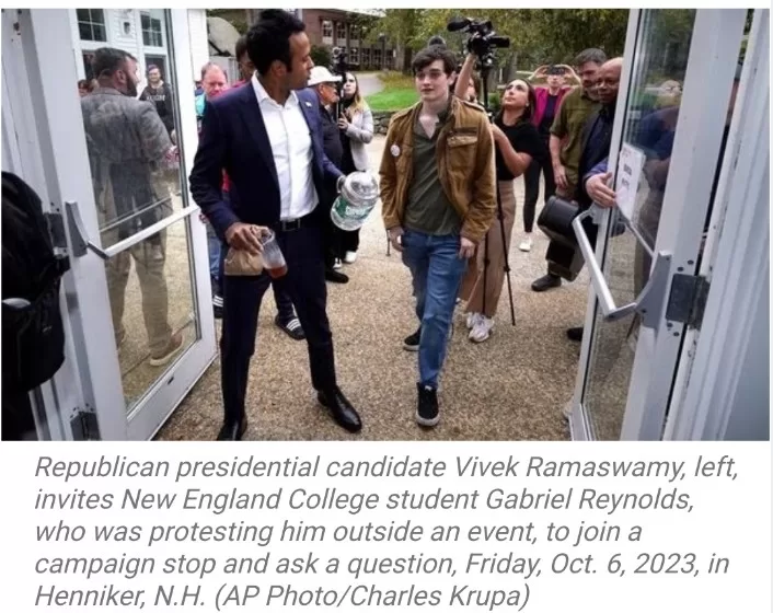 Henniker, N.H. – In a surprising turn of events, Republican presidential candidate Vivek Ramaswamy took a unique approach to address a protester who was vociferously demonstrating outside a recent campaign event. During his speech at New England College, Ramaswamy temporarily halted the town hall meeting and extended a cordial invitation to the protester to join the event and voice his concerns.