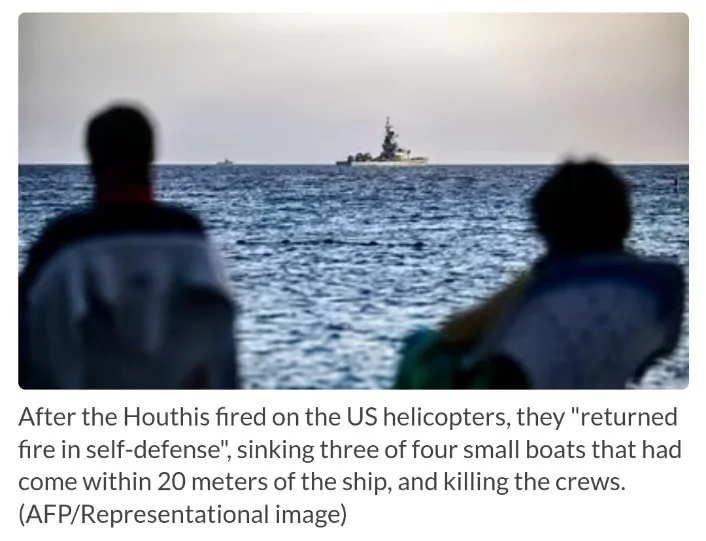 The Houthi rebels fired on US helicopters, prompting a self-defense response. Three out of four small boats approaching the container ship within 20 meters were sunk, resulting in the loss of the crews. The fourth boat managed to flee the area.