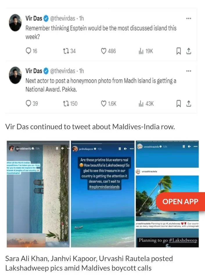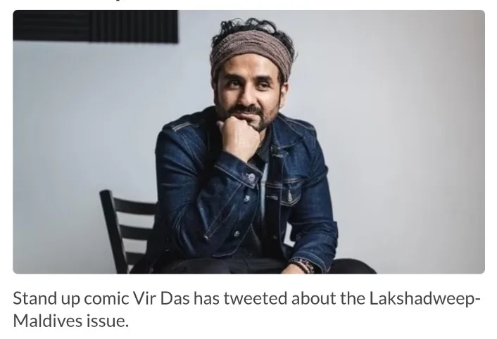 In a tweet on Monday, Vir Das humorously remarked, “Firstly, happy Lakshadweep is getting some love! Secondly, somewhere in the Maldives, right now, is an Indian celebrity/influencer, who didn’t eat carbs for two weeks, took the best vacation photos ever, and is TERRIFIED to post them.”