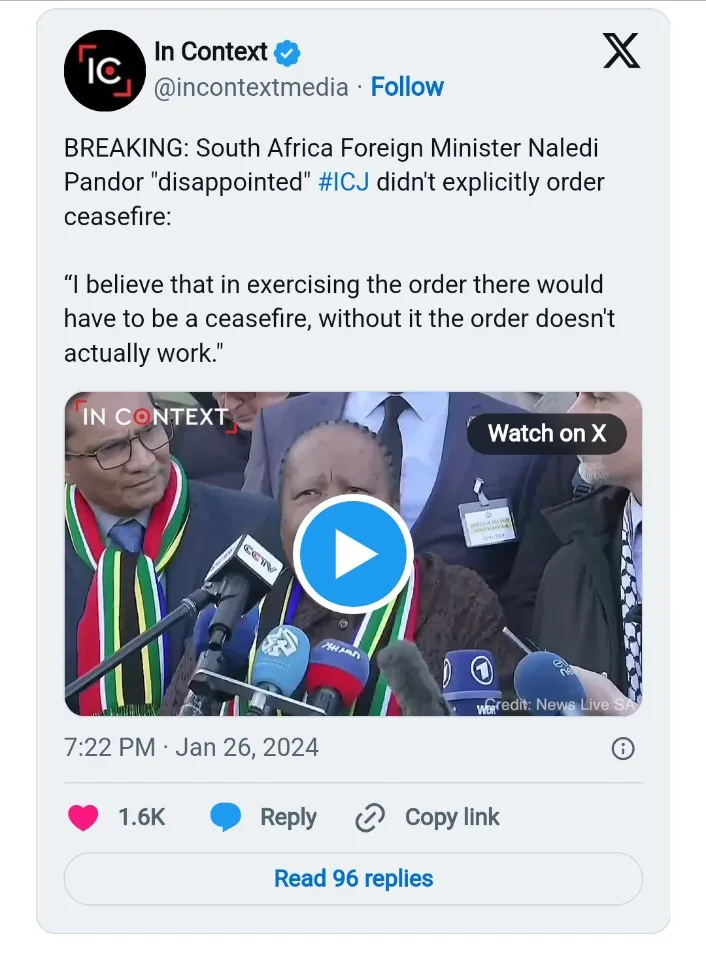 The International Court of Justice (ICJ) in The Hague had earlier handed down its first judgement in a landmark case brought by South Africa that also ordered Israel to allow humanitarian access to the Palestinian territory.