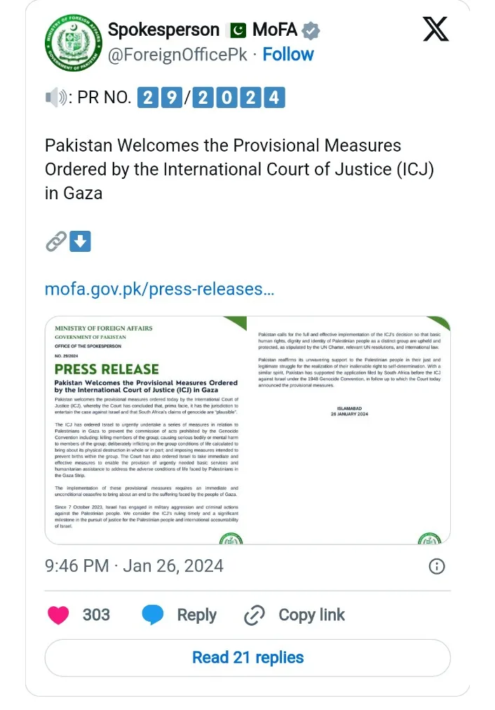 “The Court has also ordered Israel to take immediate and effective measures to enable the provision of urgently needed basic services and humanitarian assistance to address the adverse conditions of life faced by Palestinians in the Gaza Strip,” Pakistan’s Foreign Office said in a statement.
