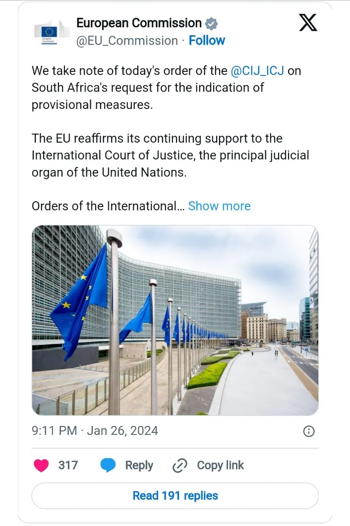 “Orders of the International Court of Justice are binding on the parties, and they must comply with them. The European Union expects their full, immediate and effective implementation,” the European Commission said.