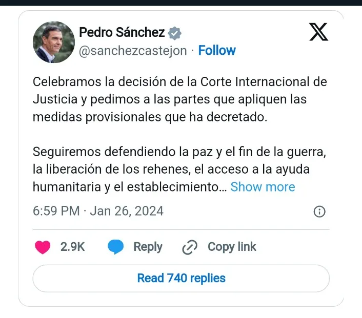 “We welcome the decision of the International Court of Justice and ask the parties to apply the provisional measures it has decreed,” Prime Minister Pedro Sanchez wrote on social network X, the former Twitter.