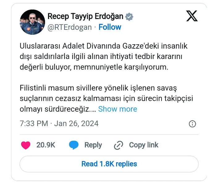 Turkish President Recep Tayyip Erdogan also hailed the ruling, saying he hoped it would halt attacks against civilians. “We hope that Israel’s attacks against women, children and the elderly will come to an end,” Erdogan said in a social media statement, calling the ruling “valuable.”